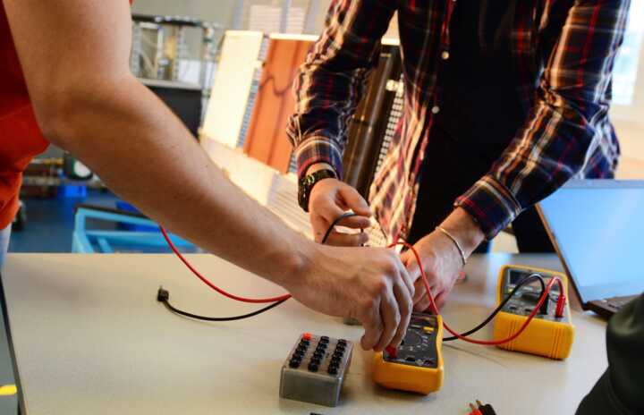 Beschreibung:Auf dem Bild sind ElektroenergietechnikerInnen zu sehen, die mit Multimetern und Kabeln elektrische Messungen durchführen.