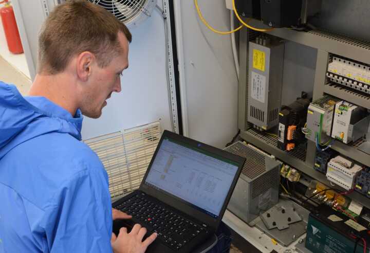 Beschreibung:Ein Elektroenergietechniker arbeitet mit einem Laptop an der Wartung eines elektrischen Schaltschranks.
