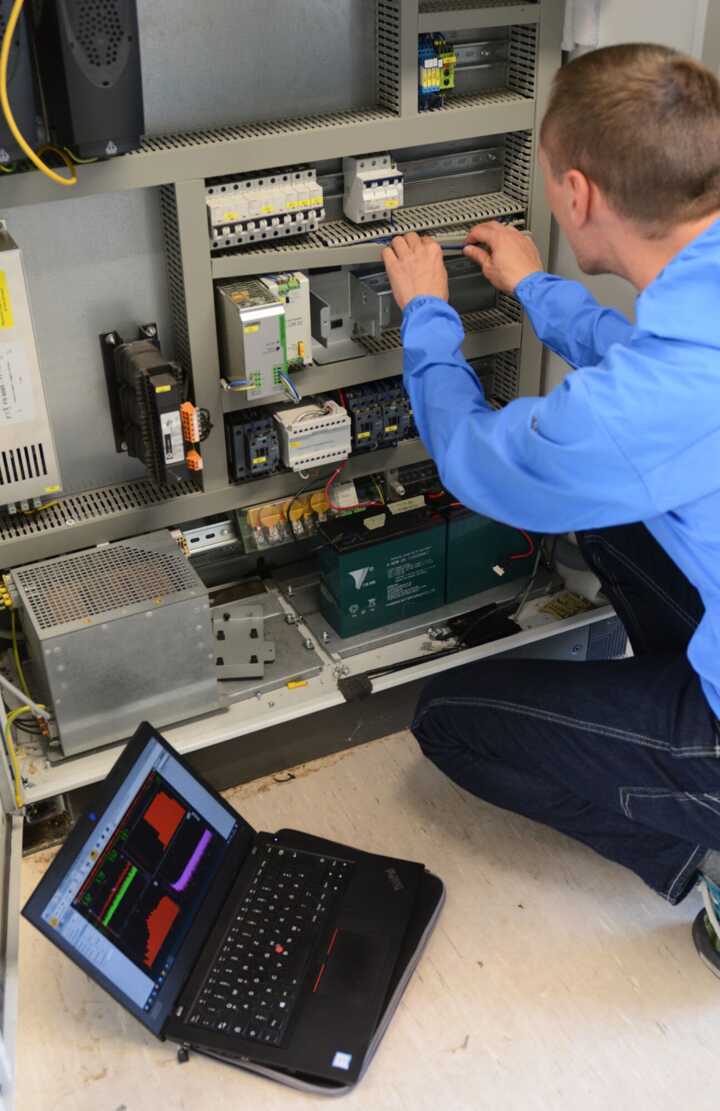 Beschreibung:Ein Elektroenergietechniker arbeitet an der Verkabelung und Konfiguration eines Schaltschrankes.