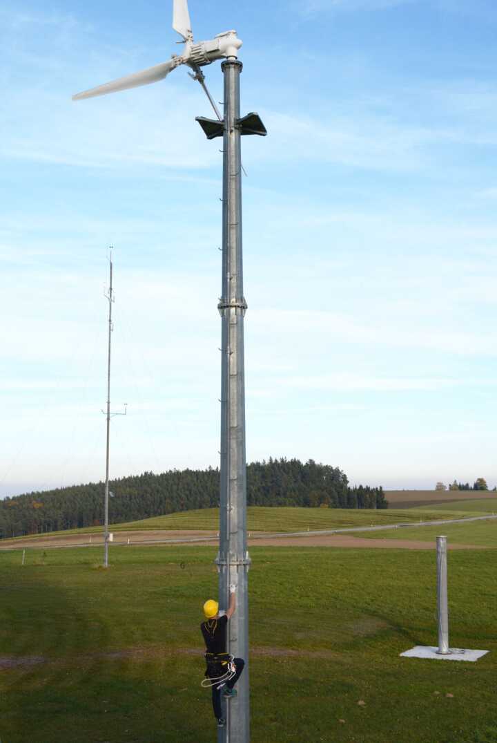 Beschreibung:Ein Elektroenergietechniker klettert gesichert an einem Windradmast hoch.