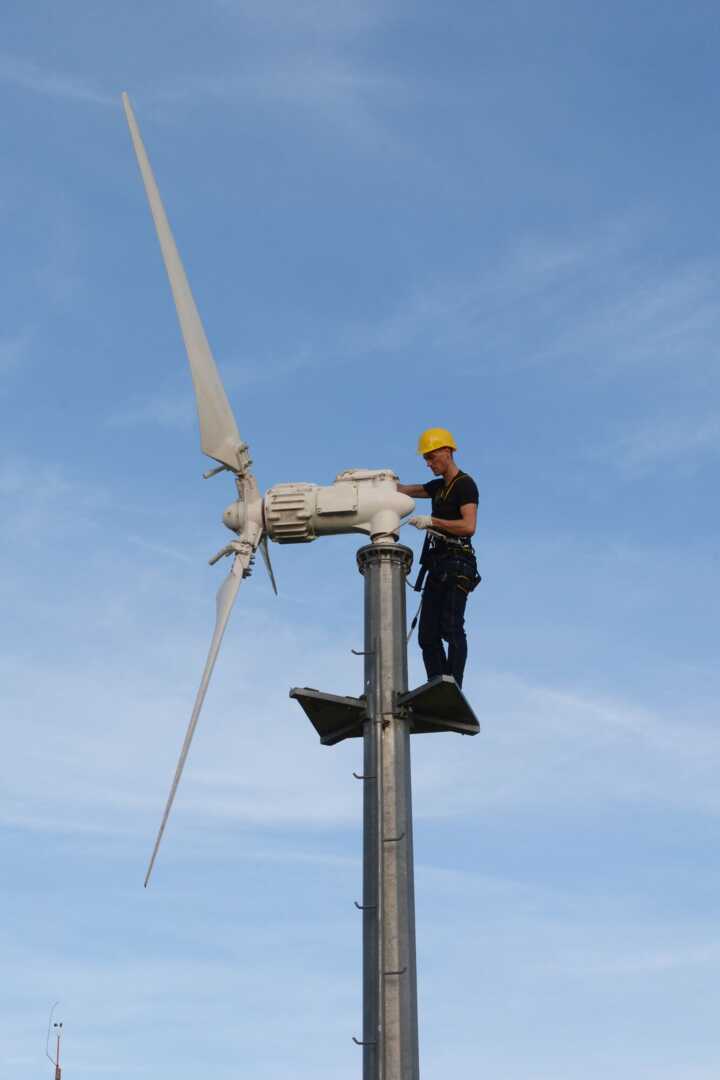 Beschreibung:Ein Elektroenergietechniker in Arbeitskleidung mit Schutzhelm führt Wartungsarbeiten an einem Windrad durch.