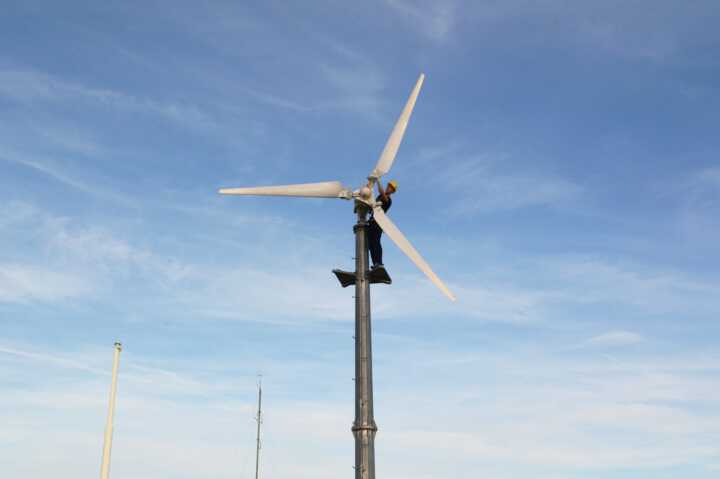 Beschreibung:Ein Elektroenergietechniker arbeitet auf einer Windkraftanlage.