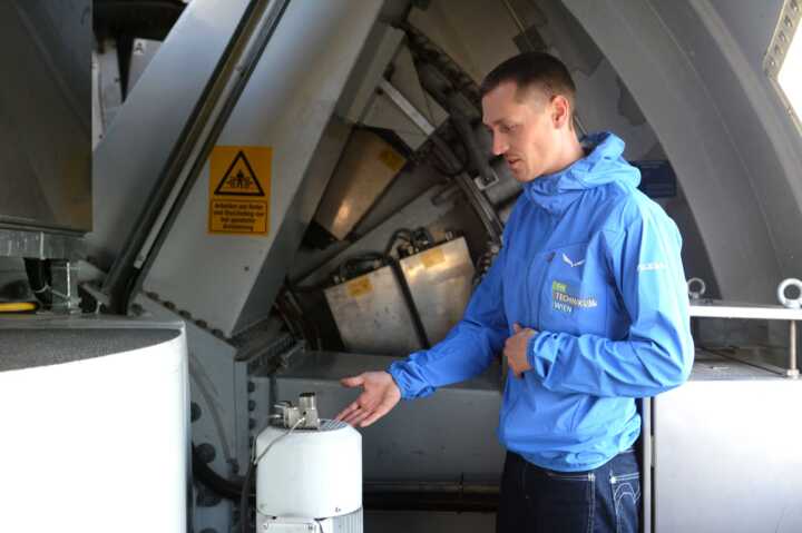 Beschreibung:Ein Elektroenergietechniker erklärt technische Ausrüstung in einem Windrad.