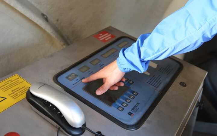 Beschreibung:Ein Elektroenergietechniker bedient ein Bedienfeld eines technischen Geräts.