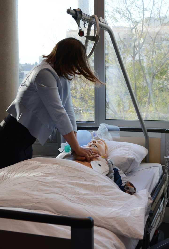 Beschreibung:Eine dipl. Gesundheits- und Krankenpflegerin führt an einer Puppe in einem Krankenhausbett eine Wiederbelebungsübung durch.