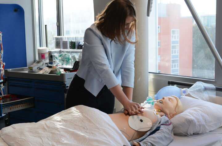 Beschreibung:Eine dipl. Gesundheits- und Krankenpflegerin übt Wiederbelebungstechniken an einer medizinischen Puppe.