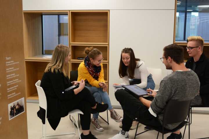 Beschreibung:Eine Gruppe von angehende PhysiotherapeutInnen sitzen zusammen und diskutieren etwas.