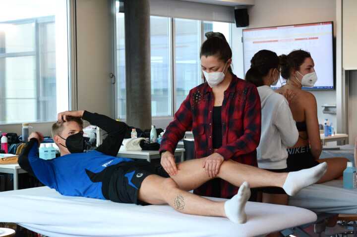Beschreibung:Das Bild zeigt eine angehende Physiotherapeutin, die einem Kollegen das Bein behandelt.