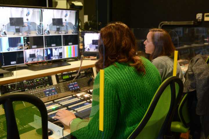 Beschreibung:Das Bild zeigt zwei Medienmanagement-Studierende, die in einem Fernsehstudio an einem Video-Mischpult arbeiten.