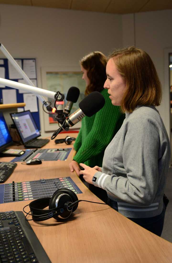 Beschreibung:Das Bild zeigt zwei Medienmanagement-Studierende, die in einem Fernsehstudio vor Mikrofonen und Computern stehen.