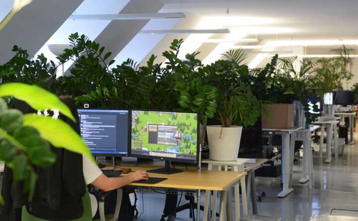 Beschreibung:In einem modernen Büro mit vielen Pflanzen arbeitet ein Gamedesigner an einem Spiel.