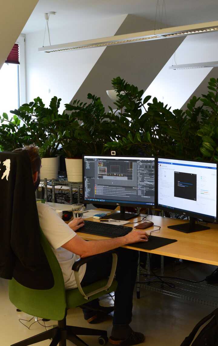 Beschreibung:Ein Gamedesigner arbeitet an einem Computer mit zwei Monitoren.