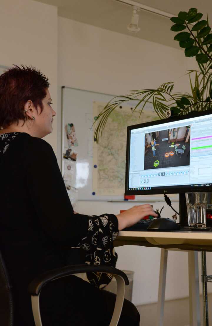 Beschreibung:Eine Gamedesignerin arbeitet an einem Computer mit 3D-Design-Software.