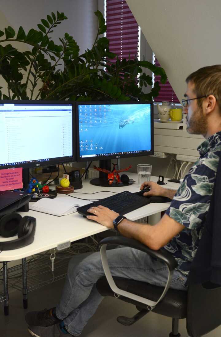 Beschreibung:Ein Gamedesigner arbeitet an einem Computerarbeitsplatz mit zwei Monitoren.