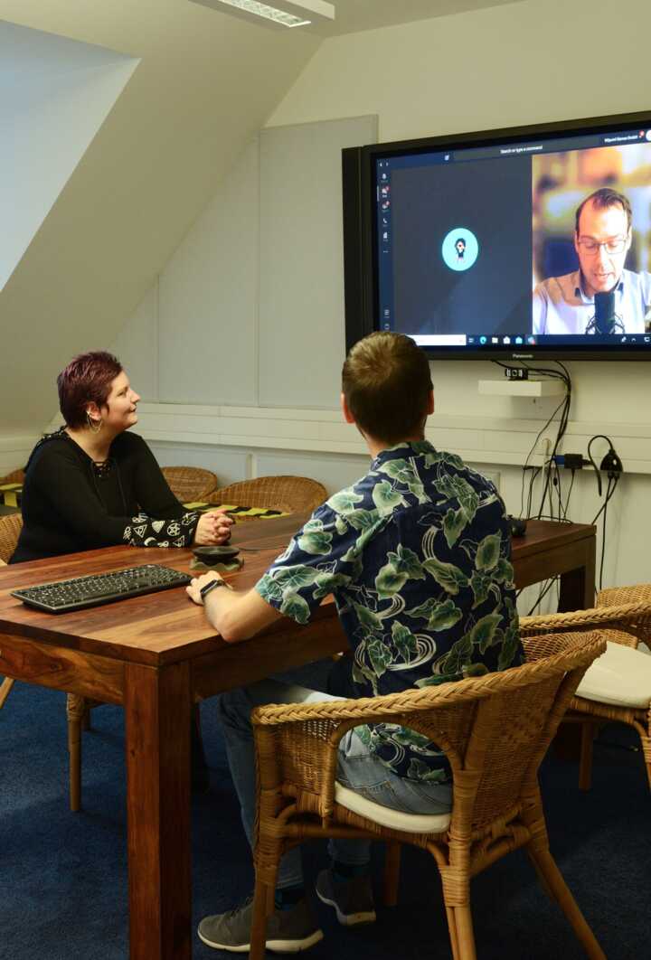 Beschreibung:Zwei GamedesignerInnen sitzen in einem Besprechungsraum und führen eine Videokonferenz mit einer dritten Person auf einem Bildschirm.