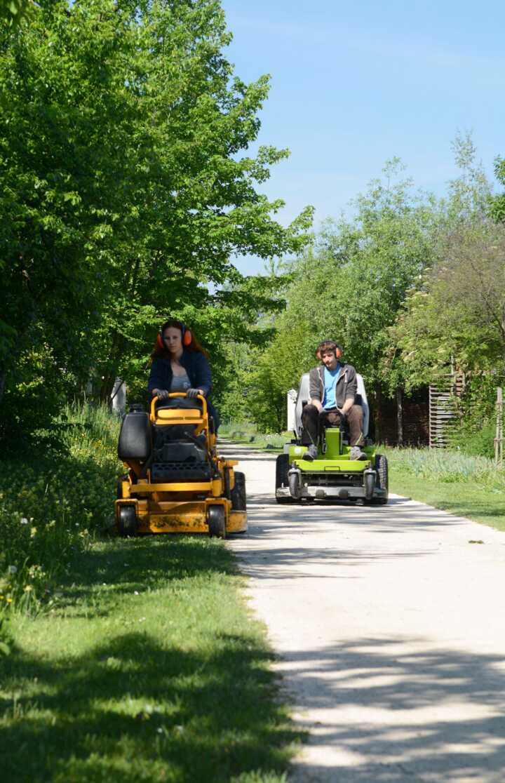 Beschreibung:Zwei Garten- & GrünflächengestalterInnen fahren auf Aufsitzrasenmähern eine von Bäumen gesäumte Straße entlang.