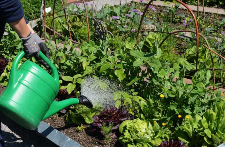 Beschreibung:Auf dem Bild gießt eine Gartengestalterin mit einer Gießkanne Pflanzen in einem Garten.
