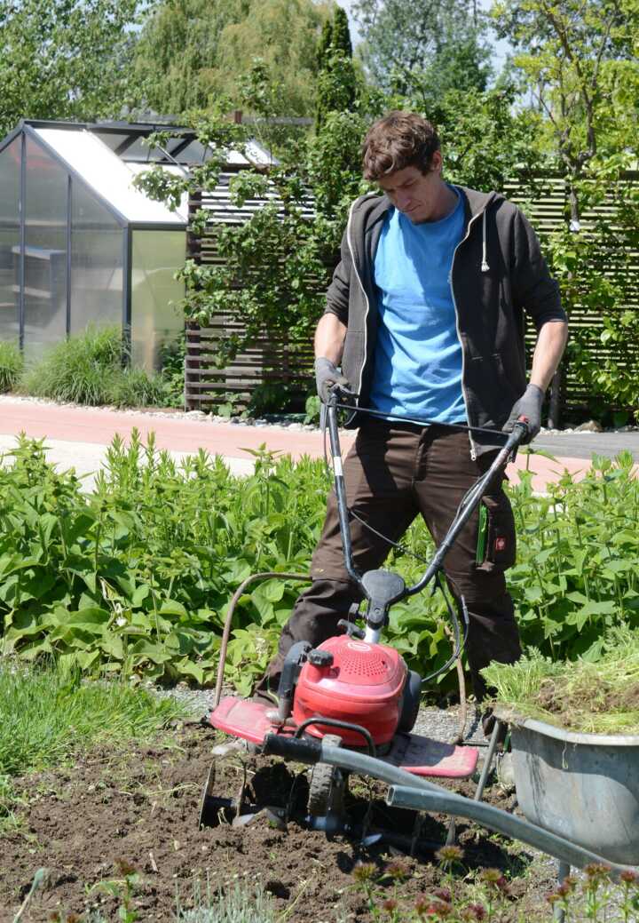 Beschreibung:Ein Gärtner benutzt eine Motorhacke, um den Boden in einem Garten umzugraben.