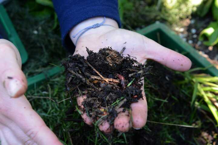 Beschreibung:Eine Garten- & Grünflächengestalterin hält Komposterde in der Hand.