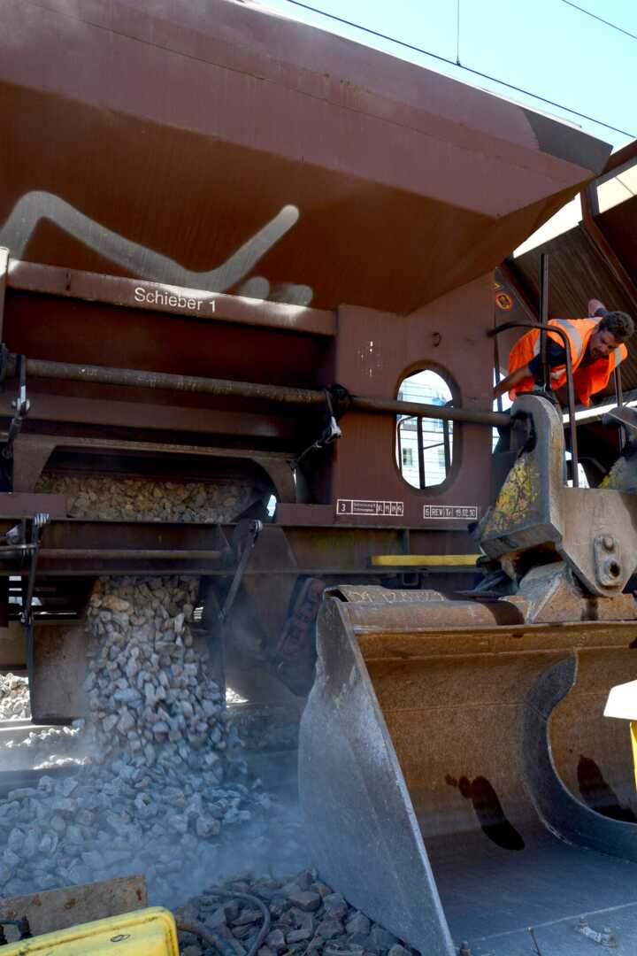 Beschreibung:Ein Gleisbautechniker in Warnweste bedient eine Baumaschine, die Schotter von einem Güterwaggon aufnimmt.