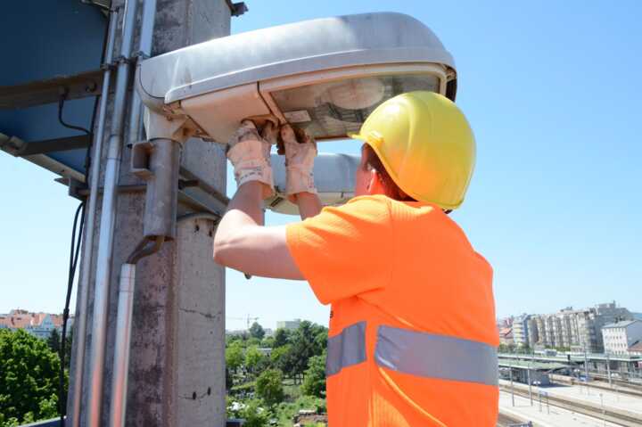 Beschreibung:Ein Gleisbautechniker in Sicherheitskleidung repariert eine Straßenlaterne.