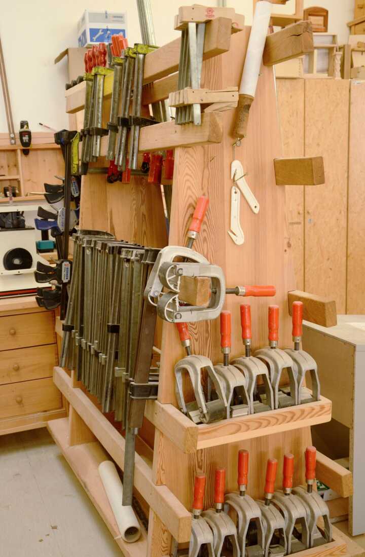 Beschreibung:Auf dem Bild sind verschiedene Zwingen in einer Werkstatt zu sehen.