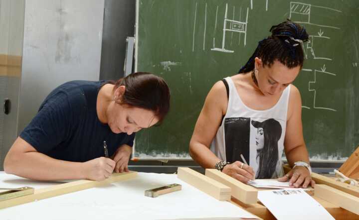 Beschreibung:Zwei Zimmerinnen arbeiten an technischen Zeichnungen .