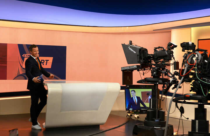 Beschreibung:Das Bild zeigt ein Fernsehstudio mit einem Moderator, der vor Kameras an einem Nachrichtentisch steht.