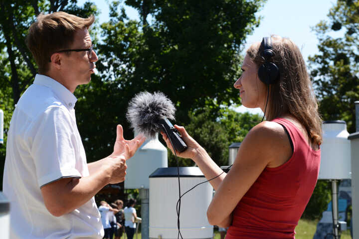 Beschreibung:Auf dem Bild ist eine Journalistin mit Kopfhörern und einem Mikrofon zu sehen, die ein Interview mit einem Mann führt.