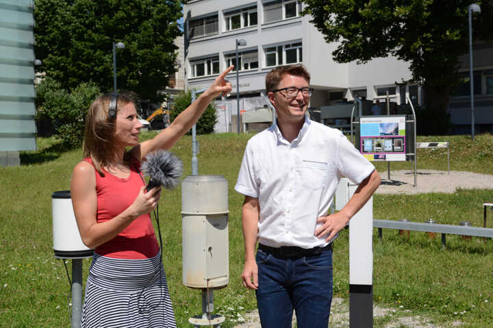 Beschreibung:Eine Journalistin führt ein Interview mit einem Mikrofon im Freien durch.