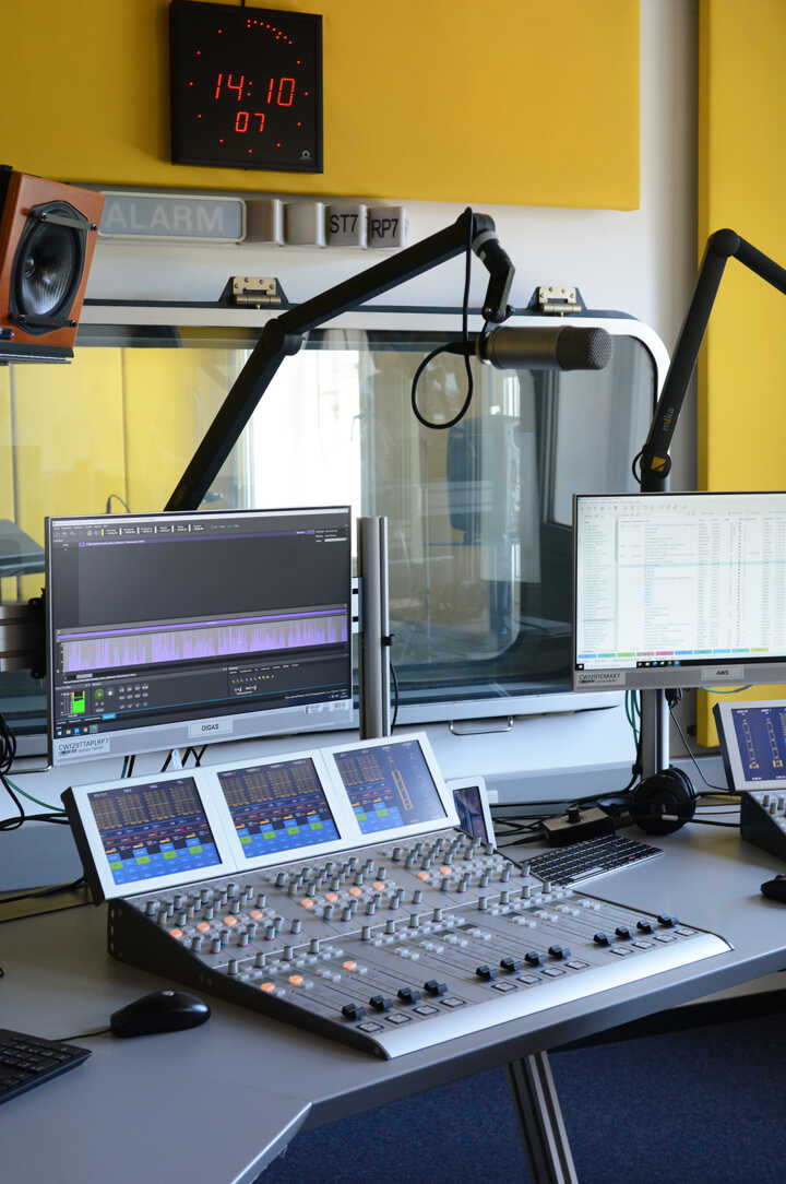 Beschreibung:Das Bild zeigt ein Radiostudio mit Mischpult und Bildschirmen.
