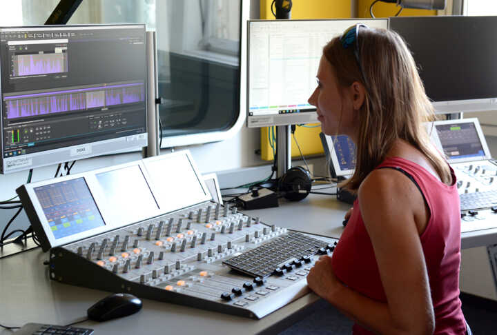 Beschreibung:Eine Journalistin arbeitet an einem Mischpult in einem Radiostudio.