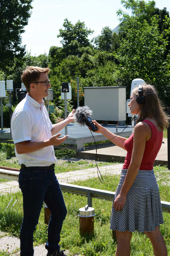 Beschreibung:Auf dem Bild ist eine Journalistin zu sehen, die ein Interview im Freien führt.