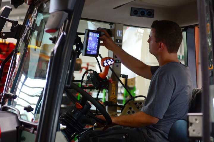 Beschreibung:Ein Land- und Baumaschinentechniker bedient die Steuerung in einem Traktor.