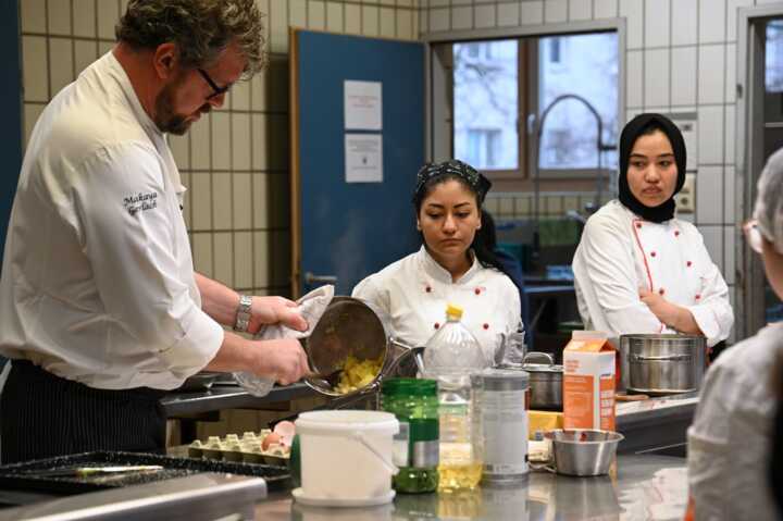 Beschreibung:Ein Berufsschullehrer zeigt zwei Schülerinnen in einer professionellen Küche, wie man eine Speise zubereitet.
