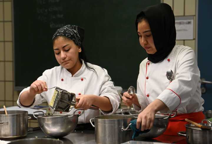 Beschreibung:Zwei Berufsschülerinnen in einer Küche reiben Käse und bereiten Zutaten vor.