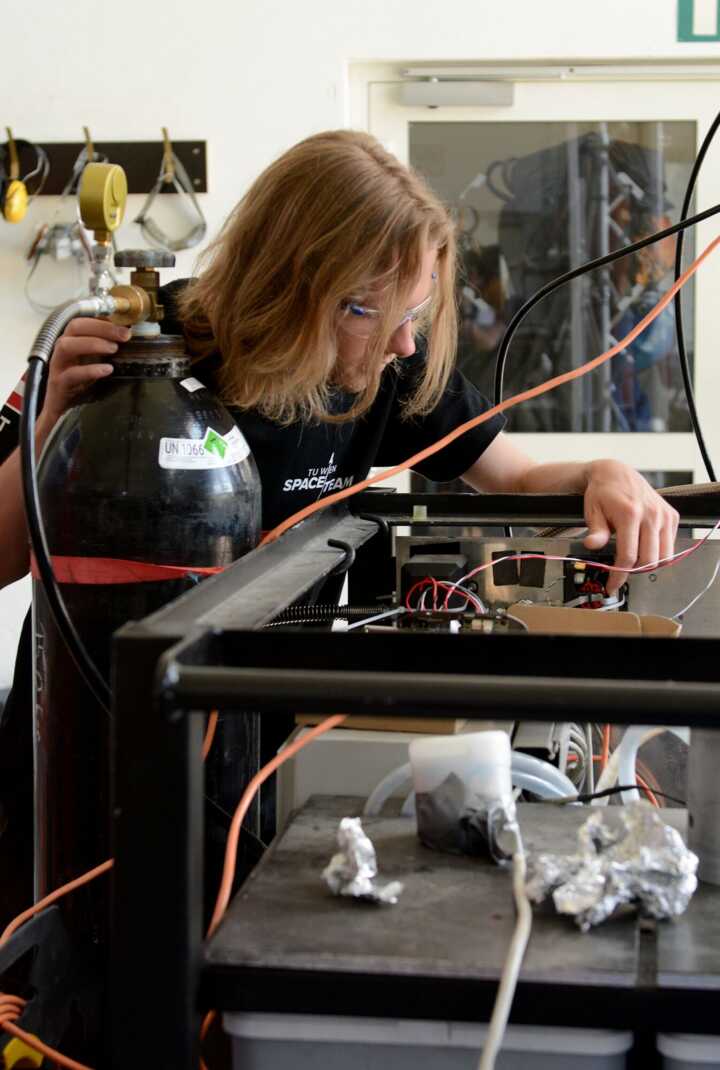 Beschreibung:Ein Mitarbeitender des SpaceTeams der TU Wien arbeitet mit technischen Geräten und Gasflaschen.