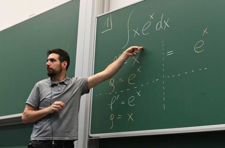 Beschreibung:Ein Hochschullehrer für Mathematik erklärt eine mathematische Gleichung an einer Tafel.