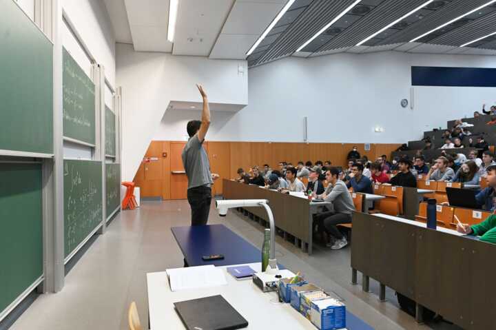 Beschreibung:Ein Dozent für Mathemarik steht vor einer gefüllten Universitätsvorlesung, während er an einer Tafel erklärt.