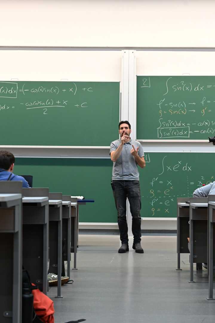Beschreibung:Ein Hochschullehrer für Mathematik steht in einem Klassenzimmer vor Tafeln mit mathematischen Formeln und unterrichtet.