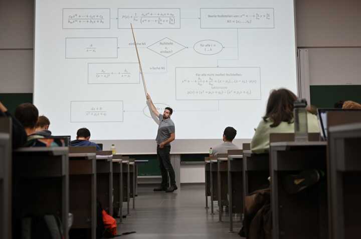 Beschreibung:Ein Hochschullehrer für Mathematik hält einen Vorlesung und zeigt mit einem Zeigestock auf mathematische Formeln auf einer Leinwand.