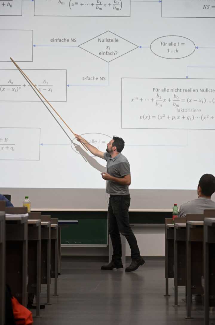 Beschreibung:Ein Dozent erklärt mathematische Konzepte an einer Tafel mit einem Diagramm.