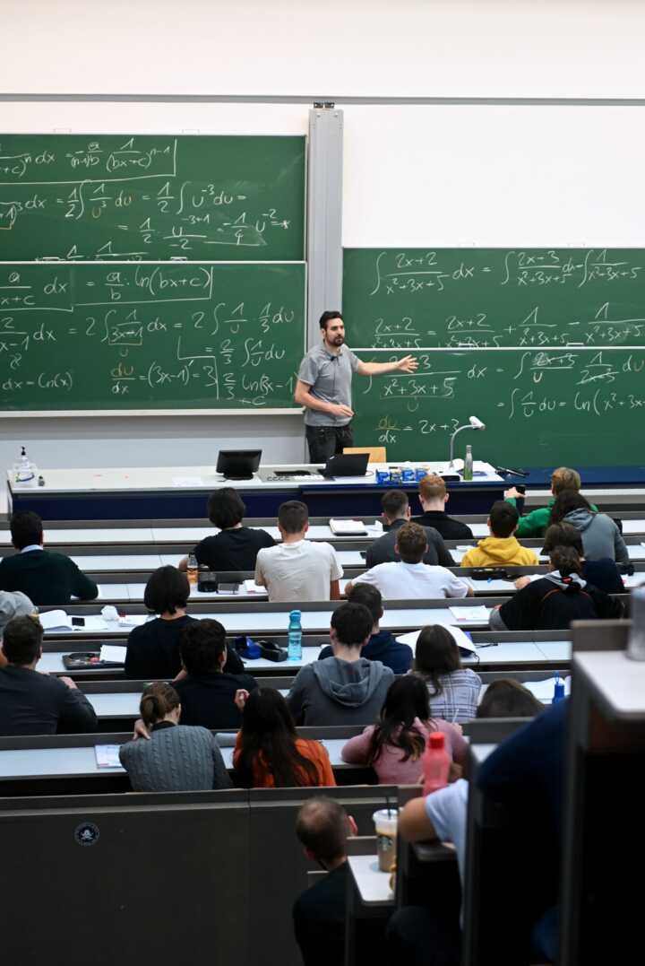 Beschreibung:Ein Dozent hält einen Mathematikvortrag vor Studierenden in einem Hörsaal.