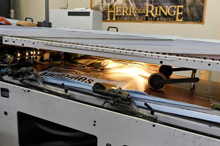 Beschreibung:Das Bild zeigt einen Druckprozess in einer Druckerei, bei dem Plakate erstellt werden.