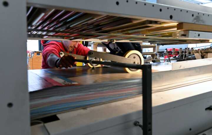 Beschreibung:Ein Medienfachmann arbeitet an einer Druckmaschine und überprüft die Druckqualität von Papierbögen.