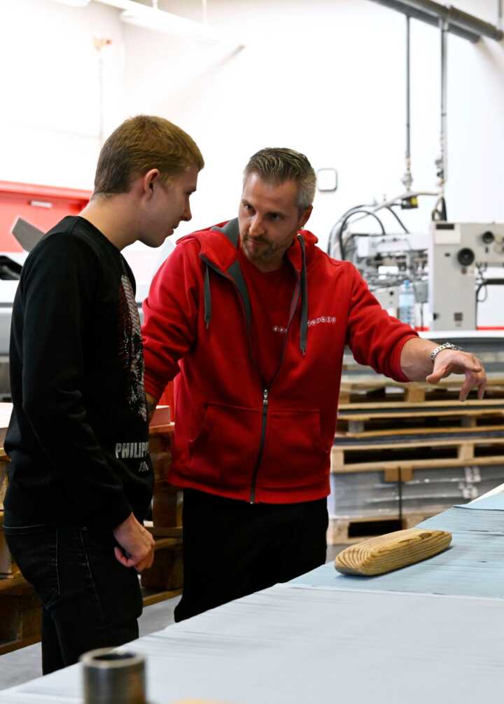 Beschreibung:Ein Medienfachmann erklärt einem Kollegen in einer Werkstatt etwas über ein Holzobjekt.