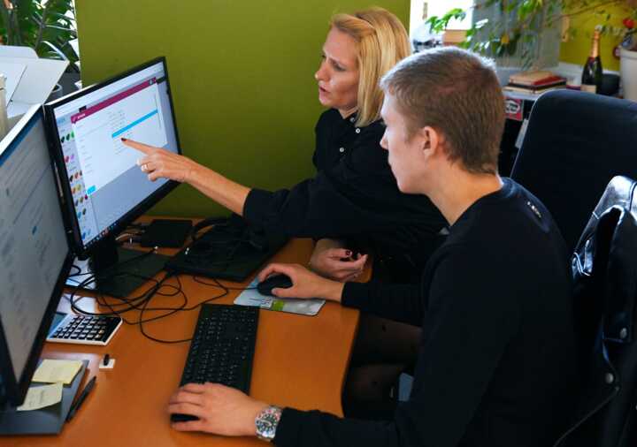 Beschreibung:Zwei Medienfachleute arbeiten konzentriert an Computern und besprechen Informationen auf dem Bildschirm.