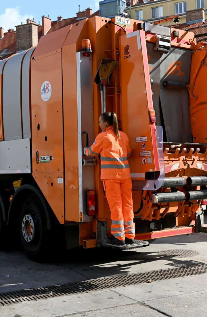 Beschreibung:Auf dem Bild ist eine Müllarbeiterin zu sehen, die in orangefarbener Schutzkleidung auf einem Müllwagen steht.