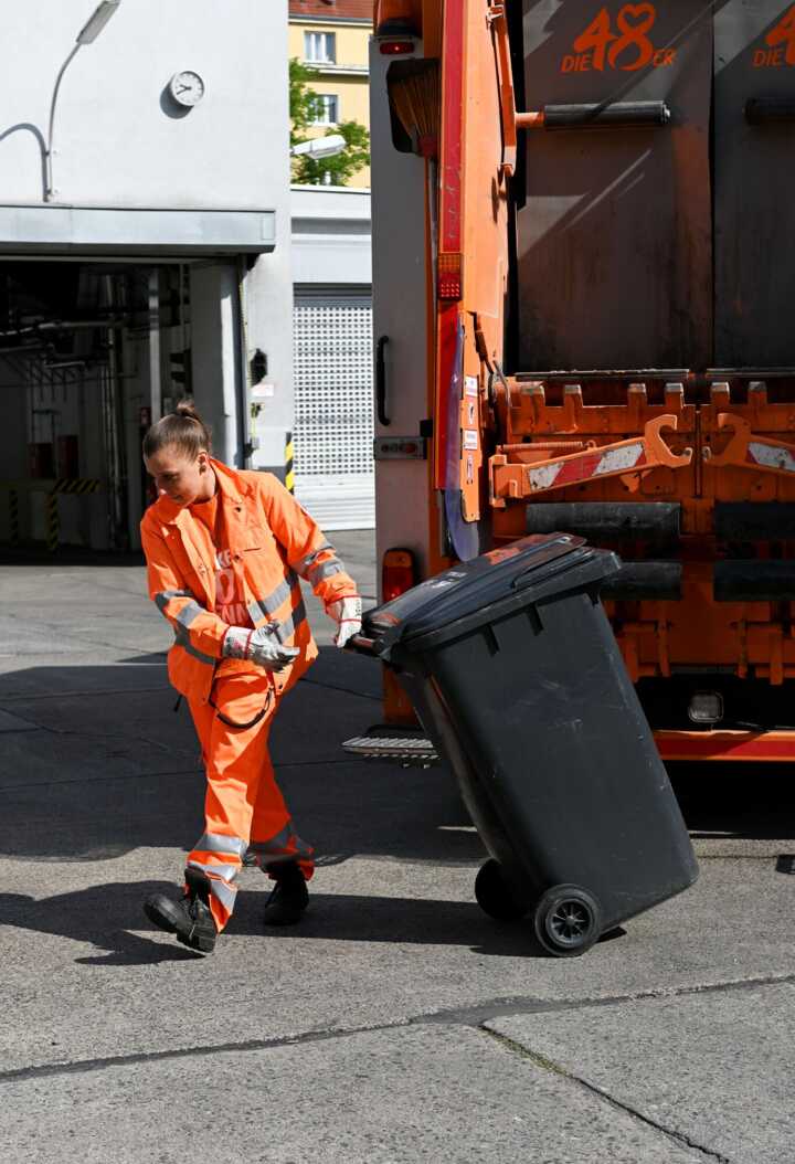 Beschreibung:Das Bild zeigt eine Müllauflegerin in orangener Arbeitskleidung, die einen Müllcontainer zu einem Müllwagen schiebt.