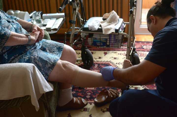 Beschreibung:Ein Pflegeassistent kümmert sich um die Beine einer älteren Person.